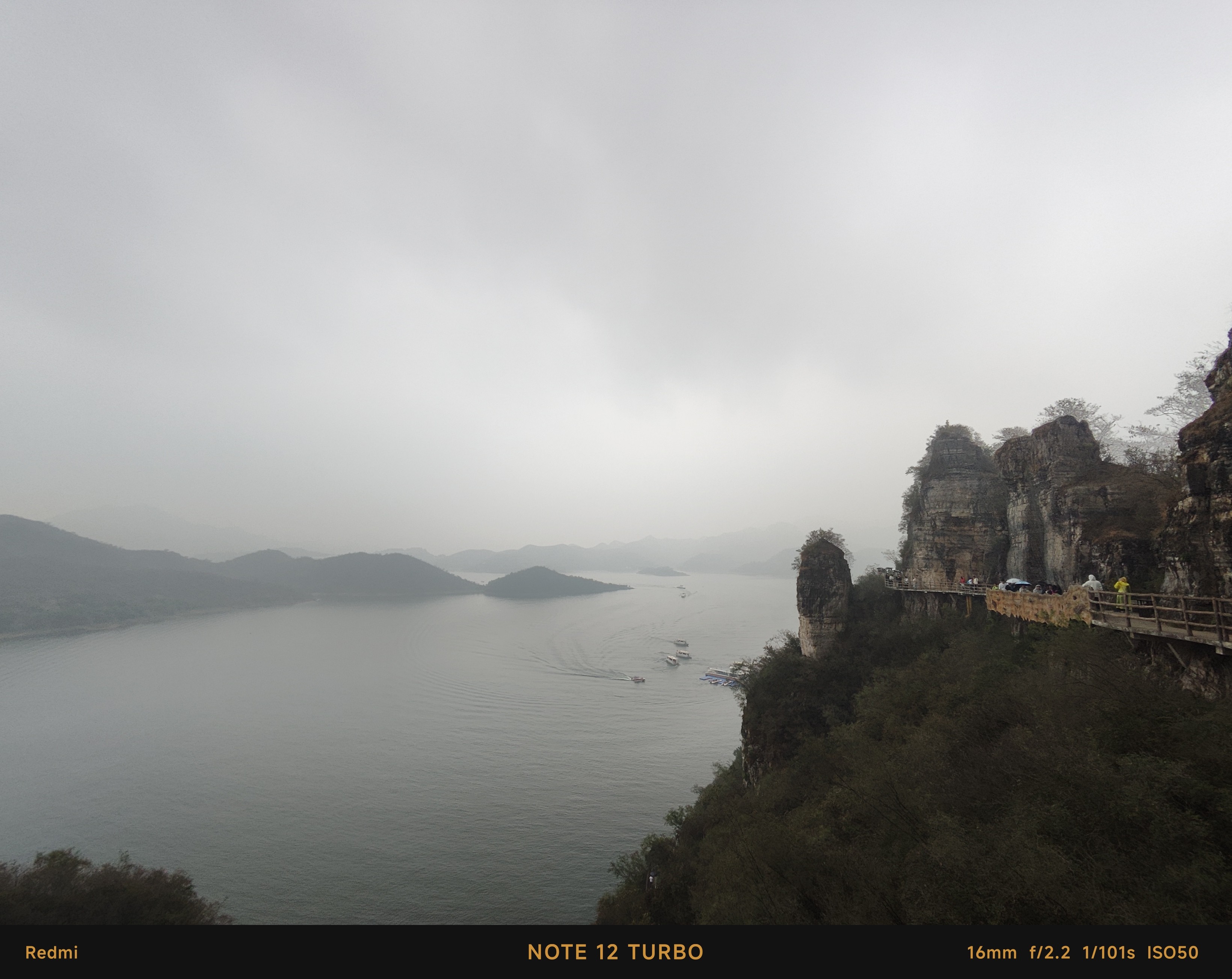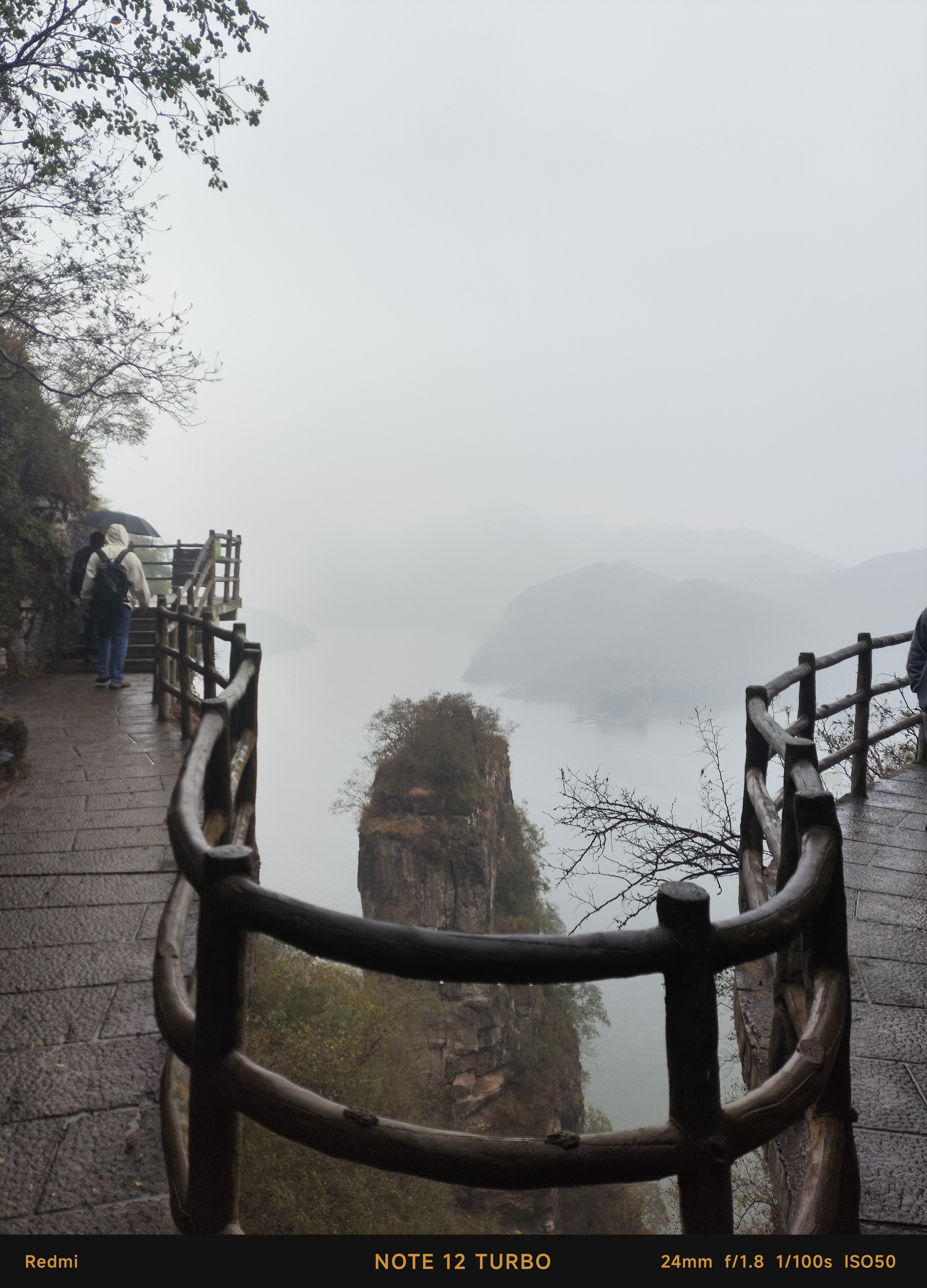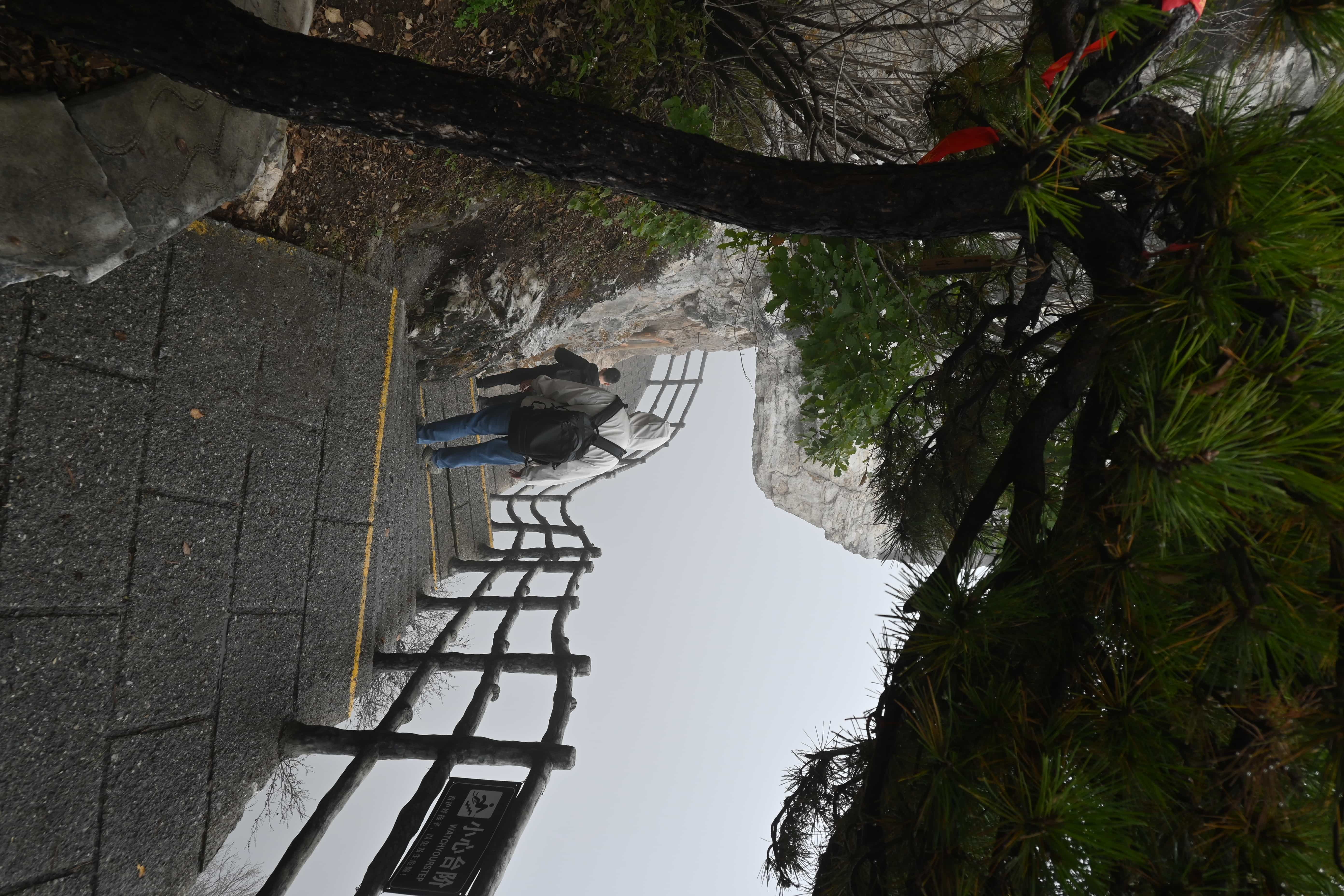 登山的过程不算艰难,不过山的形状也算是奇伟,在山间绕行,一会儿进入山的怀抱,一会儿又绕出来看看湖水。可惜这次出行天公不作美,天气阴沉下着小雨,没法感受青山、蓝天、白云、绿水的画面。取而代之的是雨雾弥漫的墨色山水画: