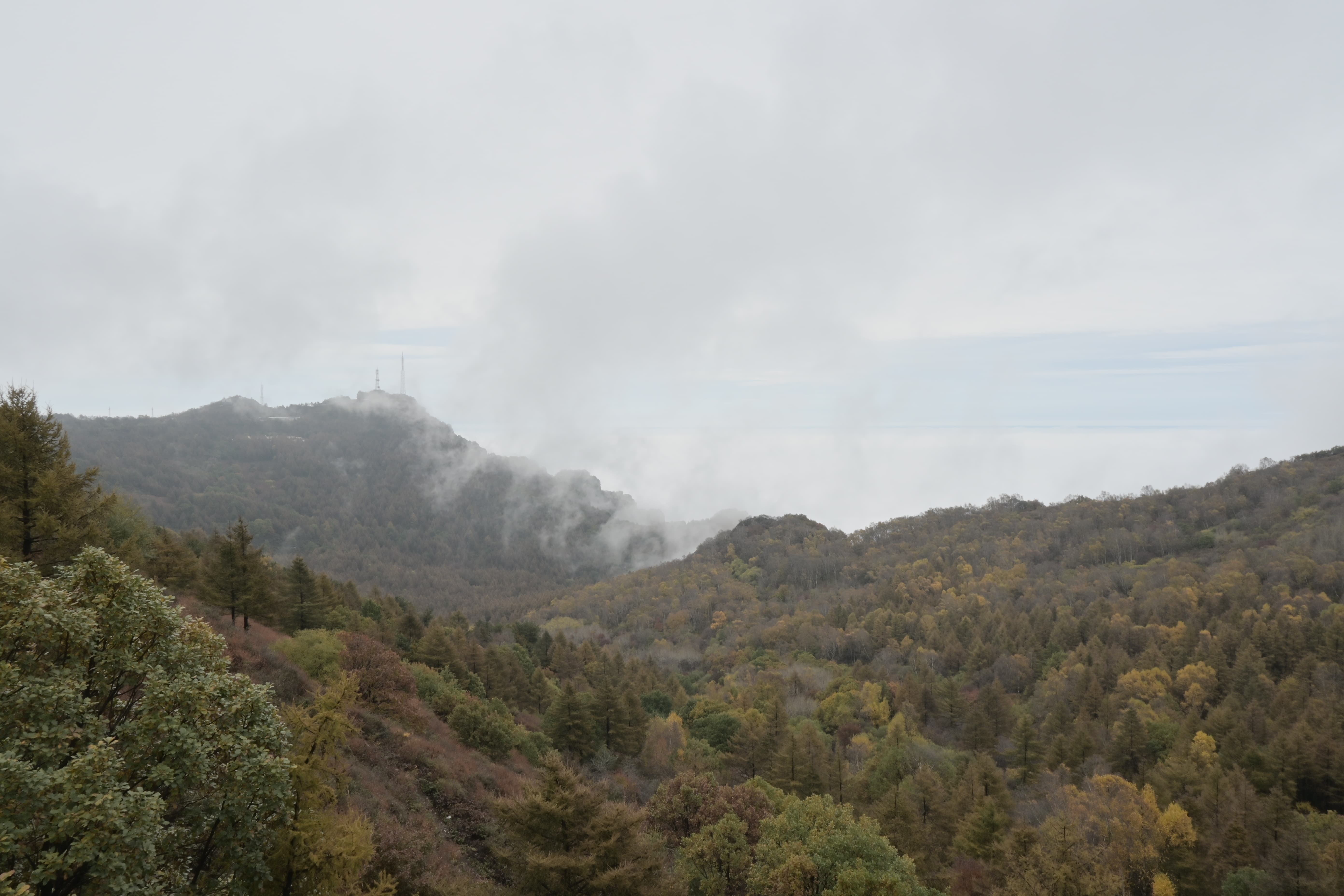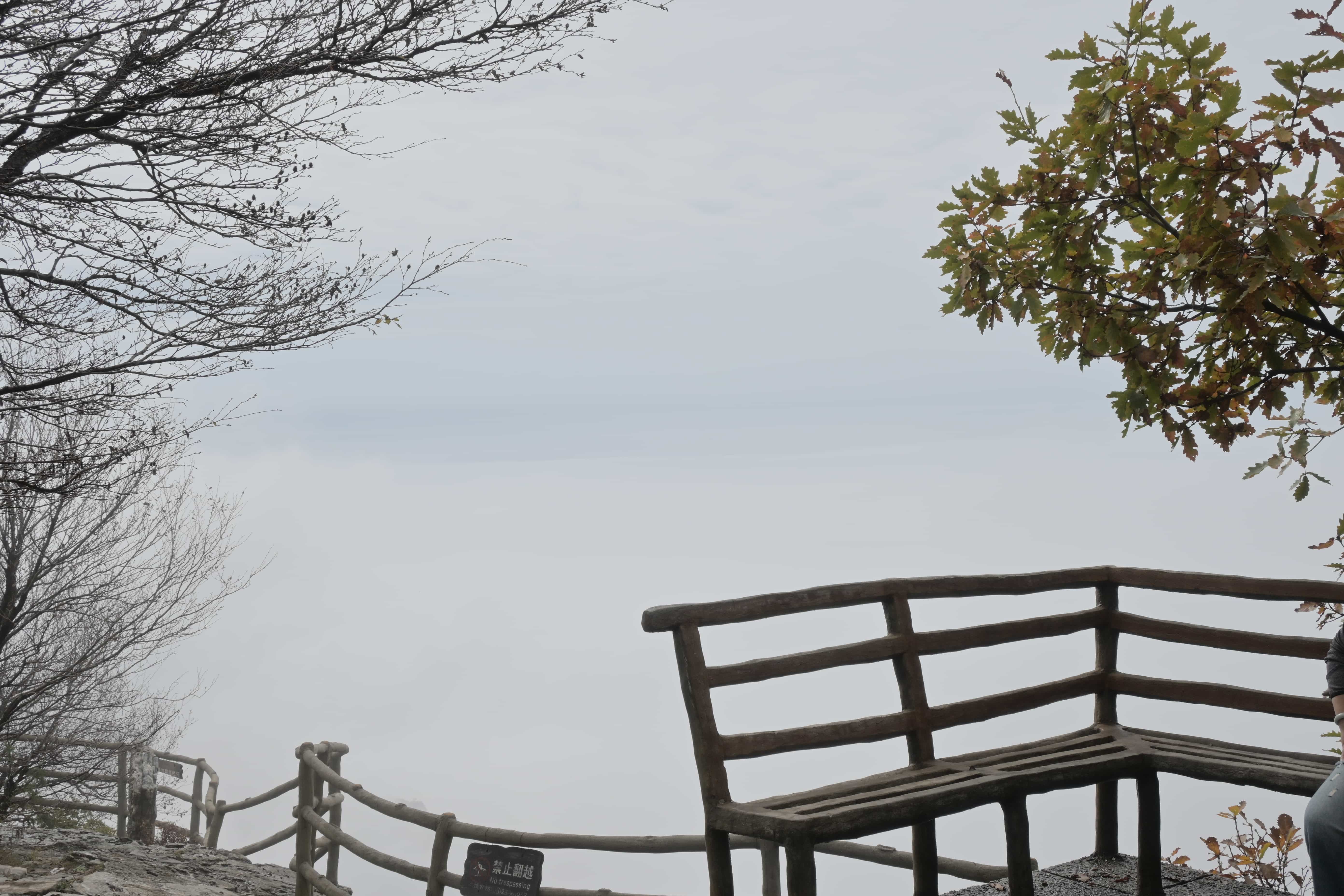 第二天一早,我们乘大巴来到了白石山脚下。为节省时间,我们选择乘索道去往山间。本想能够欣赏索道外的风景,却因为天气阴雨大雾弥漫,能见度几乎不足5米。直到来到山间仍然是什么也没有看见,也给白石山的面貌增添了几分神秘。下索道乘接驳车来到山腰的一个出发平台。在这里我们终于见到了大山的模样。凭栏望去,眼下是绵延的山脊与泛黄的草木,眼前是一片白茫茫的云海,光亮平坦广阔而宁静,仿佛置身天上人间。
